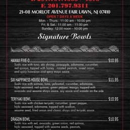 Six Happiness, a Chinese - Japanese - Sushi Bars restaurant located in Fair Lawn, NJ, offers a wide range of culinary delights to satisfy your cravings. From appetizers like Egg Rolls and Shrimp Tempura to main dishes like Orange Chicken and Beef with Broccoli, Six Happiness caters to a variety of tastes.